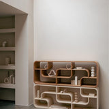 Het unieke houten ontwerp met zeven bogen is ontworpen om horizontaal of verticaal te worden geplaatst. Geniet van de eindeloze mogelijkheden als je Seven decoreert met kleurrijke objecten, boeken of vazen, waardoor het een levendig middelpunt in huis wordt.