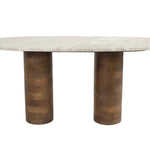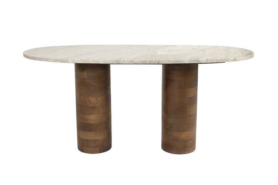 De Kouk salontafel is een ware belichaming van elegantie. Het marmeren tafelblad en de poten van acaciahout smelten naadloos samen en vormen een prachtig meubel van natuurlijke materialen. De massieve, cilindervormige houten poten zijn een aanvulling op het ovale tafelblad. Schoonheid ontmoet functionaliteit in de Kouk salontafel.