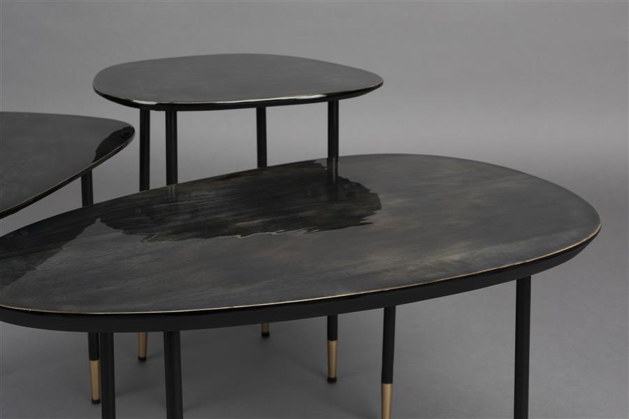 De verfijnde uitstraling van de Dutchbone Phyllis neemt je direct mee terug naar het gevoel van een jaren 50 of 60 interieur. De tafels hebben een organisch gevormd tafelblad van mangohout en pootjes van zwart metaal, met aan ieder uiteinde een goudkleurig detail. Samen met de glanzende afwerking van het tafelblad ontstaat een sophisticated look, die de sfeer in iedere ruimte direct naar een hoger niveau tilt. Door de verschillende formaten zijn de tafels perfect als salontafel in de zithoek, maar ook leuk om los van elkaar te gebruiken.
