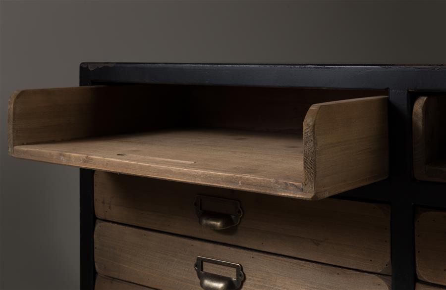 Gek op de look van een oud schoolgebouw? De Dutchbone Sol serie is precies daarop geïnspireerd. Deze robuuste kasten hebben een fijne vintage feel, dankzij het massieve hout in combinatie met het zwarte frame en de ijzeren poten. De vele lades met ijzeren handvatten en labels zorgen voor een industrieel randje en zijn bovendien praktisch. Perfect voor het opbergen van papieren of spullen die je liever niet in het zicht legt.