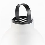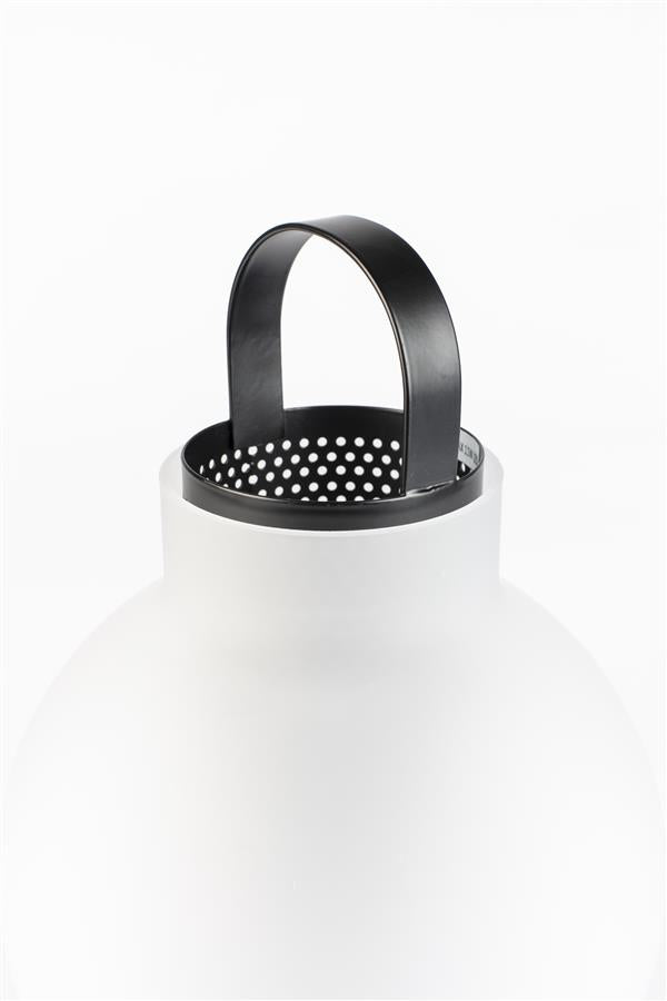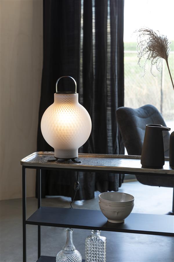 De magie van matglas blijft mooi. In tafellamp Nomad is het verantwoordelijk voor het mooie diffuse licht. De gazen binnenkant van zwart metaal versterkt dit verstrooiende effect van het licht nog meer. Nomad is een moderne herinterpretatie van de klassieke olielamp. Hij brengt net zoveel sfeer maar doet dat met moderne technieken.